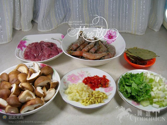 1、将虾剖背去沙线;里脊肉切薄片;香菇洗净切成两半;香叶、八角洗净;姜、蒜、泡辣椒剁碎;葱白切丁;香菜切碎。