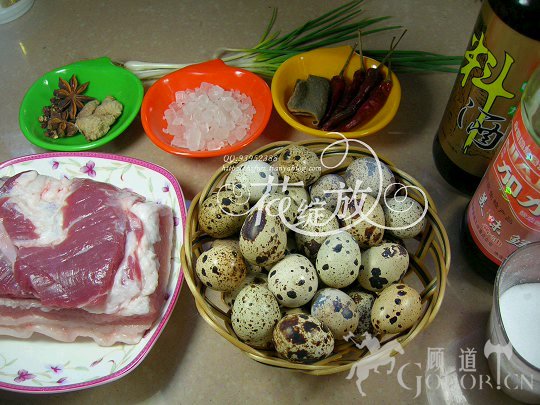 12、收干汤汁后关火,捡去葱、姜、八角、桂皮不要,将鹌鹑蛋摆放在盘子周围,再把肉盛进盘中即成。