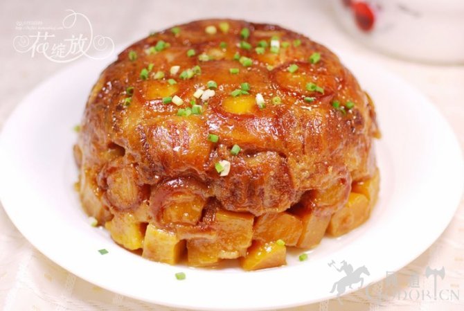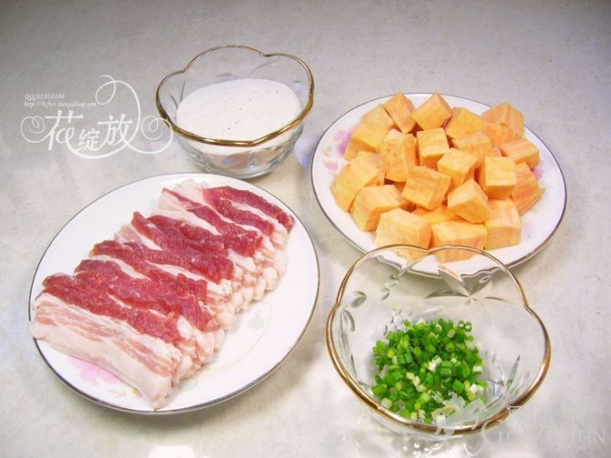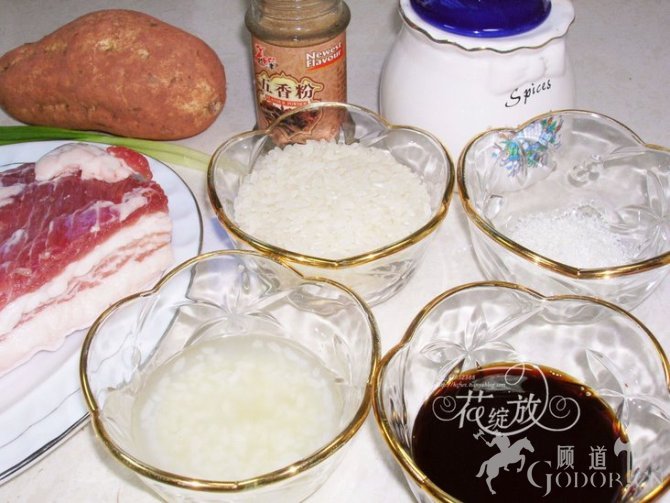 五花肉、红薯、珍珠米、葱、糖、生抽、醪糟汁、五香粉、盐。
