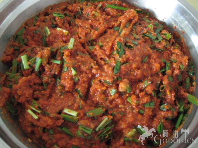 辣椒粉放入盆中、将凉米饭糊加热后、放入辣椒粉中搅匀晾凉后,将大蒜、生姜、苹果梨、圆葱、萝卜、虾酱用搅汁机磨成末放入搅匀,将精盐、味精、白糖、韭菜段放入再次搅匀即成辣椒末.。