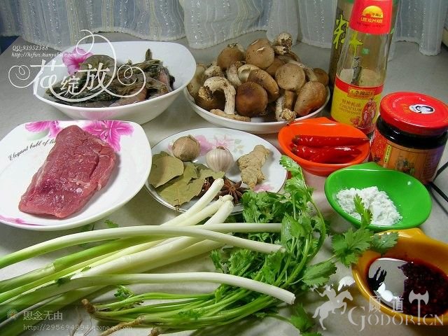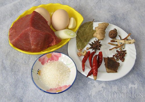 调味料:花椒、陈皮、草果、老姜、香叶、甘草、干辣椒、桂皮、八角、冰糖、大葱段、白糖小茴香、酱油、食盐。