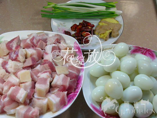 3、五花肉捞出后切成约一厘米见方的块(可依个人喜欢的大小切块);鹌鹑蛋取出后用凉水浸泡约五分钟后去壳,用厨房用纸拭干水分;老姜拍破;香葱切成两段;干辣切段。