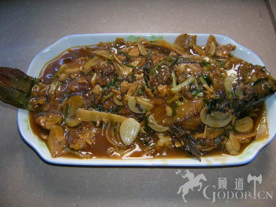 4、将锅中的汤汁勾芡后,淋入鱼盘中即成。