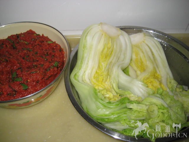 将大白菜除去老帮洗净,切开根部用手掰成两半,用刀切白菜心易碎,所以要用手掰。在盐水中泡一会儿,然后往白菜茎部撒些粗盐,腌渍约8–10小时捞出洗净。将大蒜、生姜、苹果梨、圆葱、萝卜、虾酱放入搅汁机磨成末。韭菜切段,将凉米饭加水用搅汁机打成糊。