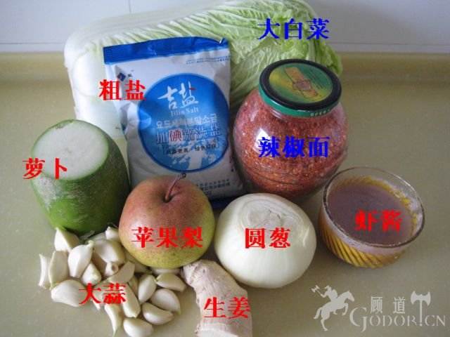 原料:大白菜两棵(盐水__大粒盐3杯,水15杯)、萝卜1/2个、圆葱1个、韭菜少许.。