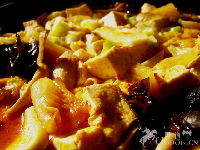 泡菜、豆腐、木耳和蘑菇。~~泡菜切块,油热后放入煸炒,加少许番茄酱,出来后汤色会更漂亮。出香味后放入木耳,加水、盐、冰糖、豆腐,小火炖煮几分钟,待豆腐入味,放入蘑菇,开锅后即可。